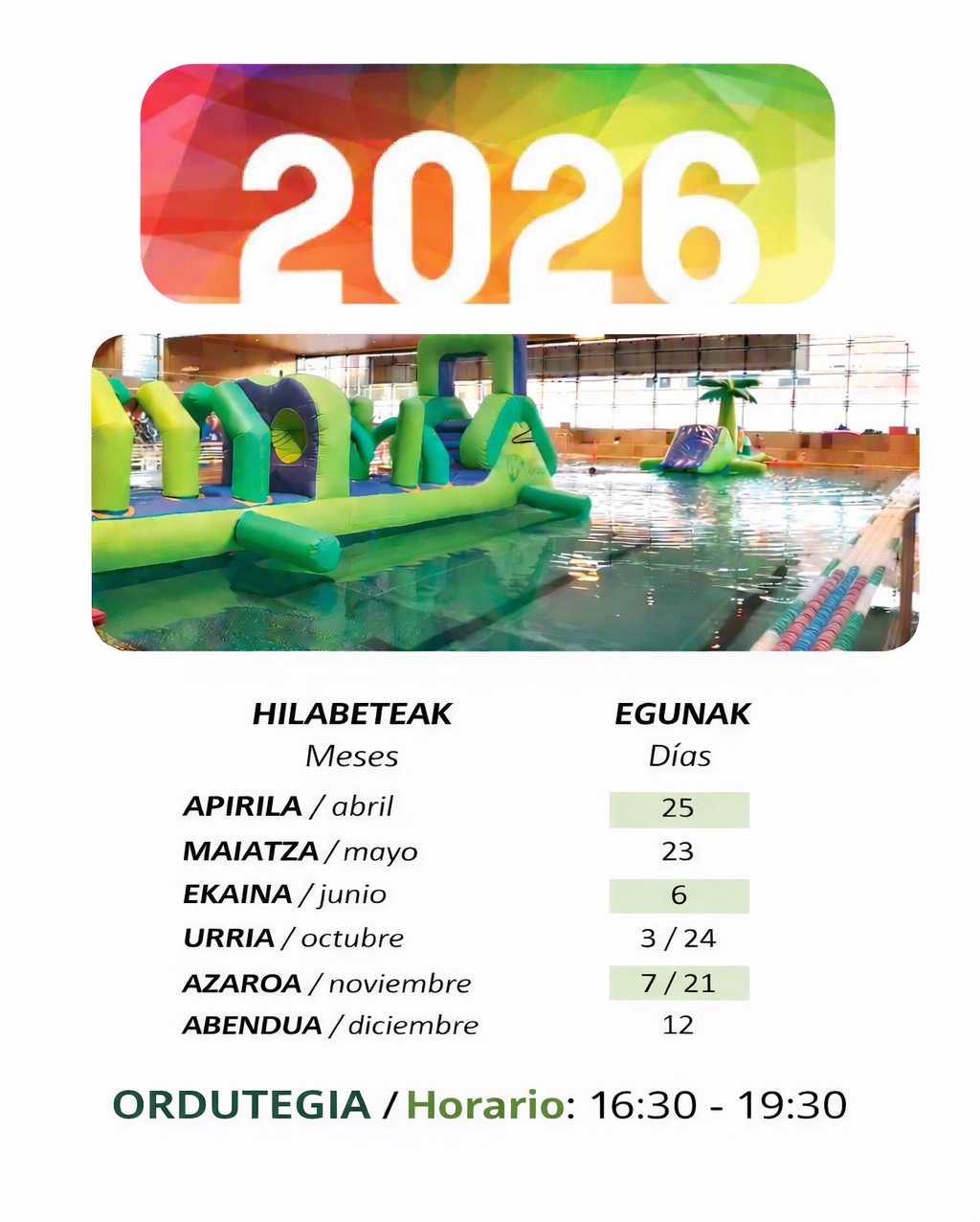 - Cada niña/o debe inscribirse en las franjas de media hora de 16:30 a 19:00 para que se gestione correctamente el espacio de los hinchables, bien por la web de Durango Kirolak (registrándose) o en la recepción de Landako II.