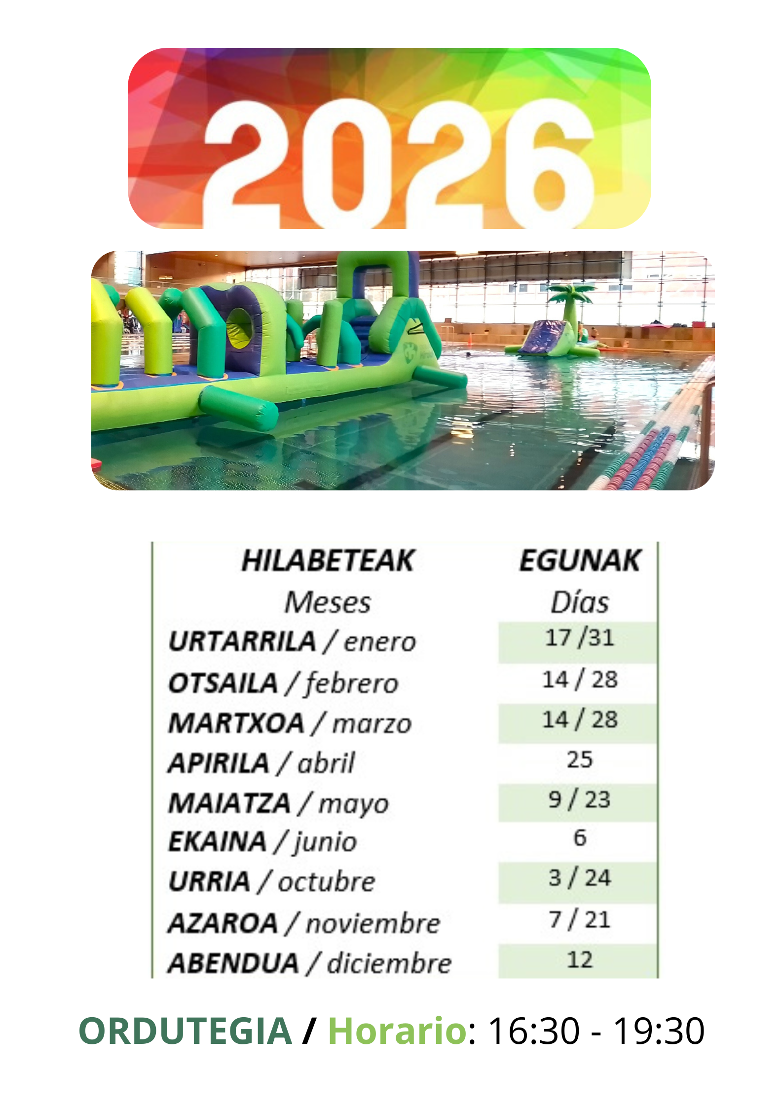 - Cada niña/o debe inscribirse en las franjas de media hora de 16:30 a 19:00 para que se gestione correctamente el espacio de los hinchables, bien por la web de Durango Kirolak (registrándose) o en la recepción de Landako II.